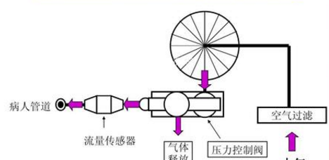 流量傳感器將測量到的實際值饋送到電子控制部分與面板設(shè)置值比較,利用兩者間的誤差控制伺服閥門來調(diào)節(jié)吸入和呼出氣體流量;