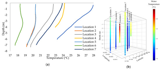 無(wú)人機(jī)04 00035 g006 550 圖6. 按位置和水深分布的水溫分布:(a)2D散點(diǎn)圖和(b)3D散點(diǎn)圖。