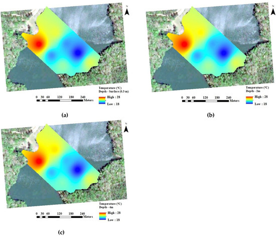 每個(gè)位置的測(cè)量次數(shù)取決于水深。深度測(cè)量表明下降過(guò)程中探頭的深度。因此,一旦探頭到達(dá)水柱底部,就有望進(jìn)行重復(fù)測(cè)量。在一定深度后重復(fù)進(jìn)行的測(cè)量被指定為該采樣位置的最大水深。收集的水深和溫度數(shù)據(jù)用于創(chuàng)建測(cè)深圖和水溫圖,以可視化地表(0.3 m)以及2 m和4 m深度處的水溫分布。逆距離加權(quán)插值(IDW)方法用于ArcMap(ESRI,Redlands,CA,美國(guó))中的處理和插值。27 ]。評(píng)估水深,水溫和位置之間的關(guān)系。在R軟件(R-GUI,維也納,奧地利)驅(qū)動(dòng)的3D散點(diǎn)圖中說(shuō)明了水溫分布[ 28 ]。