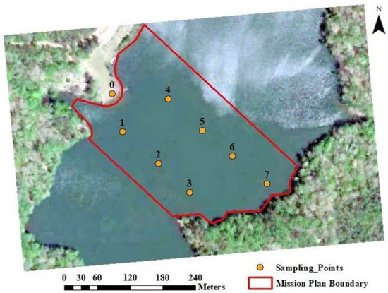 由于聯(lián)邦航空局(FAA)施加的飛行限制和電池電量的限制,在湖的一小部分中進(jìn)行了水溫剖面試驗(yàn)。美國(guó)聯(lián)邦航空局(FAA)要求無(wú)人機(jī)飛行必須在視線范圍內(nèi),且最高高度應(yīng)高于地面120 m [ 25 ]。由于這些限制,采樣位置被選擇在無(wú)人機(jī)能夠以有限的電池電量訪問(wèn)而又保持在視線范圍內(nèi)的區(qū)域。圖3中的地圖將無(wú)人機(jī)發(fā)射位置標(biāo)記為零,并將水采樣位置標(biāo)記為數(shù)字1到7。。無(wú)人機(jī)發(fā)射地點(diǎn)沒(méi)有樹(shù)木,為安全起降提供了平坦的地面。水采樣位置以網(wǎng)格采樣方式分配,同時(shí)分散以提供水溫測(cè)量值,以代表任務(wù)計(jì)劃邊界內(nèi)的整個(gè)區(qū)域。采樣位置之間的距離為80 m至90 m。從發(fā)射點(diǎn)到采樣點(diǎn)一的最短飛行距離為73 m,從發(fā)射點(diǎn)到采樣點(diǎn)七的最長(zhǎng)的飛行距離為290 m。