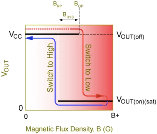 呈現(xiàn)出足夠強(qiáng)度(磁通密度)的正磁場(chǎng)(南極)的磁體將導(dǎo)致設(shè)備切換到導(dǎo)通狀態(tài)。一旦打開,單極IC將保持導(dǎo)通狀態(tài),直到磁場(chǎng)消失并且IC恢復(fù)為截止?fàn)顟B(tài)為止。