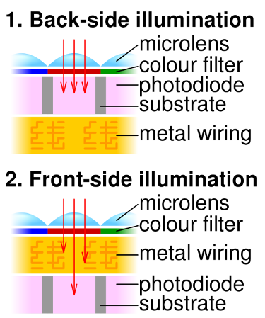 正面照明(FSI或FI)已經(jīng)成熟,生產(chǎn)成本越來越低。盡管現(xiàn)在接近2微米的高分辨率傳感器限制了光敏區(qū)域,但這卻導(dǎo)致了更高的良率。添加到微透鏡的其他光導(dǎo)已將盡可能多的光導(dǎo)引到有限的感光區(qū)域,但是1至2μm是像素大小的臨界點(diǎn)。