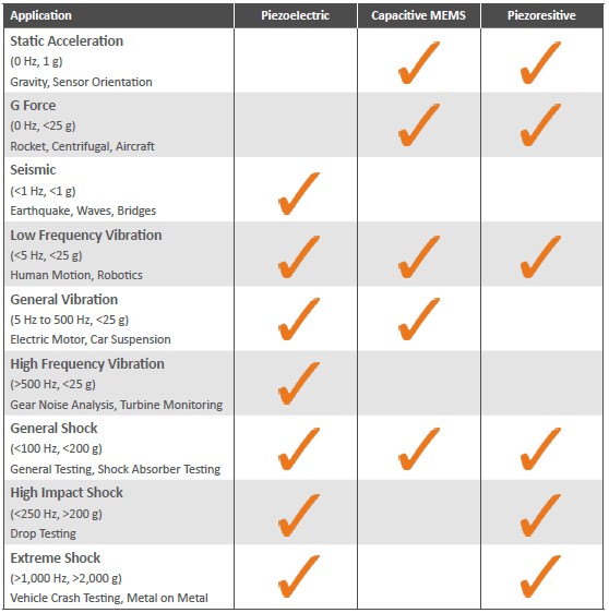 下表總結(jié)了如何為您的應(yīng)用選擇合適的加速度計。