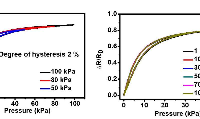 圖2.在不同壓力水平(左)和經(jīng)過(guò)不同循環(huán)次數(shù)(右)后,傳感器的磁滯回線。圖片來(lái)源:韓國(guó)科學(xué)技術(shù)高等研究院(KAIST)
