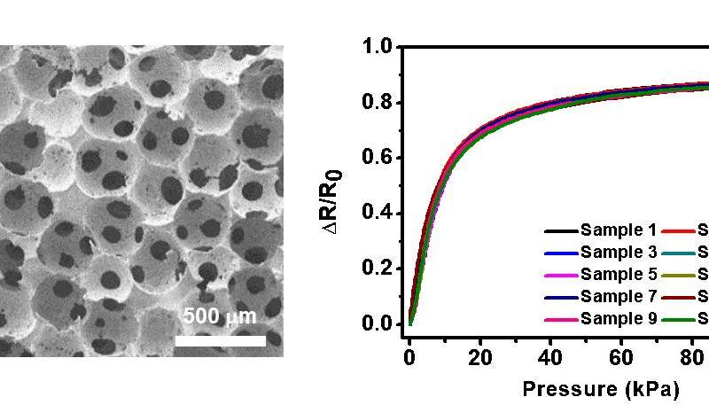 圖1.具有均勻孔徑和形狀的多孔彈性體模板的圖像(左),該圖顯示了傳感器性能的高度均勻性(右)。圖片來(lái)源:韓國(guó)科學(xué)技術(shù)高等研究院(KAIST)