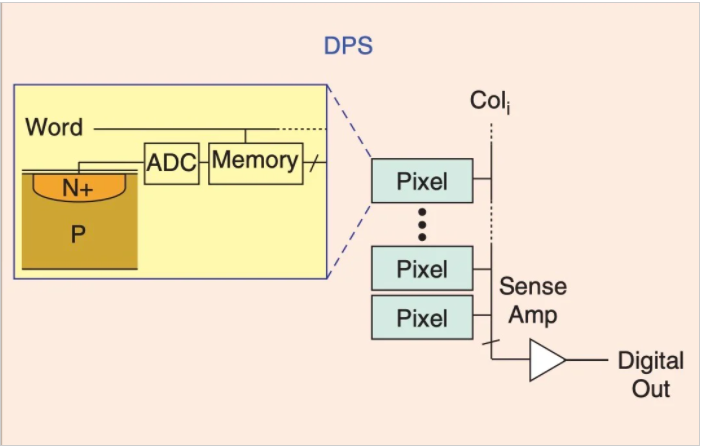 上圖顯示了APS(有源像素傳感器)架構(gòu)。在APS設(shè)備中,每個(gè)像素位置不僅包含光電二極管,而且包含放大器。一種稱為PPS(無(wú)源像素傳感器)的更簡(jiǎn)單的體系結(jié)構(gòu)沒有將放大器集成到像素中。在DPS(數(shù)字像素傳感器)設(shè)備中,每個(gè)像素都有自己的模數(shù)轉(zhuǎn)換器和存儲(chǔ)塊。因此,DPS體系結(jié)構(gòu)中的像素輸出與光強(qiáng)度成比例的數(shù)字值。