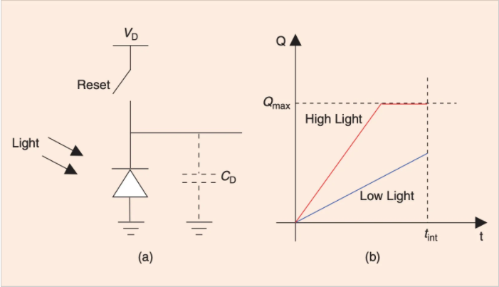 重置開關(guān)在曝光周期開始時(shí)閉合,以將光電二極管反向偏置到VD電壓。接下來(lái),開關(guān)斷開,并產(chǎn)生與入射光強(qiáng)度成比例的光電流。該電流在毫微微安至皮安安的范圍內(nèi),并且太小而無(wú)法直接測(cè)量。如果我們讓光電二極管在設(shè)定的時(shí)間段內(nèi)(色調(diào))曝光,則電流將在二極管電容CD上積分。所存儲(chǔ)的電荷為我們提供了更容易測(cè)量的更強(qiáng)的累積信號(hào)。此外,合并的平均過程使累積的信號(hào)更真實(shí)地表示所測(cè)量的光強(qiáng)度,尤其是在處理微弱或嘈雜的信號(hào)時(shí)。