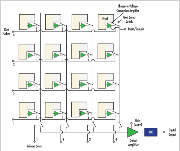 光電探測(cè)器的二維陣列用于感測(cè)入射光強(qiáng)度。光電探測(cè)器產(chǎn)生的電荷被轉(zhuǎn)換為電壓信號(hào),并通過“行選擇”和“列選擇”開關(guān)陣列傳遞到輸出放大器。ADC用于數(shù)字化放大后的信號(hào)。