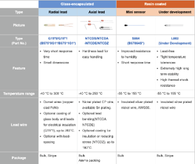 環(huán)氧樹脂涂層的NTC元件結(jié)構(gòu)堅(jiān)固,測(cè)量溫度通常在-55°C至+ 155°C之間,而玻璃封裝的NTC元件的測(cè)量溫度最高可達(dá)+ 300°C。對(duì)于需要極快響應(yīng)時(shí)間的應(yīng)用,玻璃封裝的元件是更合適的選擇。它們也更緊湊,直徑小至0.8mm。