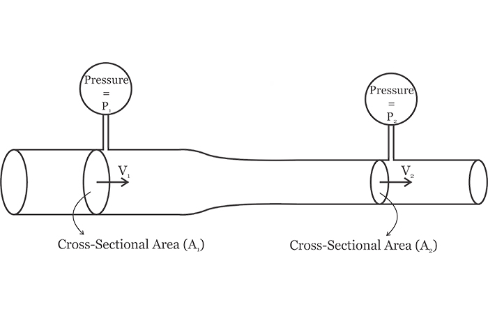 在哪里 ΔXΔt;用流體速度V代替。因此,我們可以通過簡(jiǎn)單地測(cè)量流體速度來計(jì)算流體的體積流速?梢酝ㄟ^將上面討論的概念應(yīng)用于具有變化的橫截面的管道來實(shí)現(xiàn)速度測(cè)量,如圖3所示。
