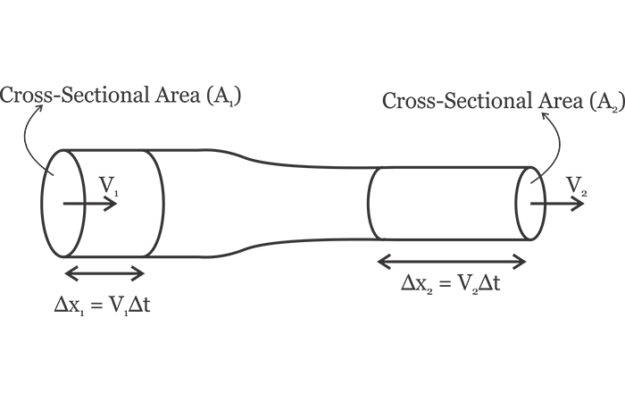 假設(shè)流體以的速度進(jìn)入管道的左端V1。超過橫截面積的流體顆粒A1 將會(huì)經(jīng)過 Δx1 一小段時(shí)間后Δt。