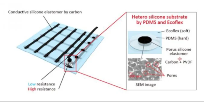 在發(fā)表的論文中,研究人員描述了使用兩種不同的材料(一種軟材料和一種硬材料)來保護(hù)傳感器伸展和準(zhǔn)確測量運動的能力。將硬硅樹脂(PDMS)沿著陣列上的電極放置,并在每個放置的核心處放置可感測壓力的柔軟的多孔硅樹脂。