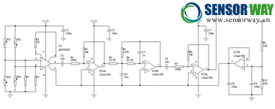 在本電路中,RS1、RS2、RS3和RS4是光刻在MEMS懸臂梁上的四可變電阻;R*是零位調(diào)整電阻;儀表放大 器AD620和C2組成前置級交流放大器,放大原始信號;AD708是高精度雙運放芯片,IC2/A和R2、R3組成 反相比例放大器,目的是調(diào)準中間級放大倍數(shù);IC/2B和R4、R5、C4、C5組成多路反饋、壓控、二節(jié)低通 有源濾波器,濾除高頻干擾波;IC/3A和R7、R8組成反相比例放大器,調(diào)整整個電路的輸出,也稱滿足刻 輸出。因為該套電路要和計算機接口,需要設(shè)計中心電壓,本設(shè)計的中心電壓為1.65V,IC3/B和R9、R10 組成跟隨電壓穩(wěn)壓電路,使IC3/B運放輸出電路接口電位為1.65V,從而保持整個電路的中心電壓為1.65V。