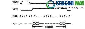 VSYNC是垂直場同步信號(也是每幀同步信號,CMOS是按列采集圖像的),其下降沿表示一幀圖像的開始,HREF提供了一種有效的控制方式,當輸出像素行列分別處于設定窗口之間時HREF為有效高電平,此時輸出有效的視頻數(shù)據(jù),PCLK是輸出數(shù)據(jù)同步信號,上升沿輸出一個有效的像素Y[7∶M].