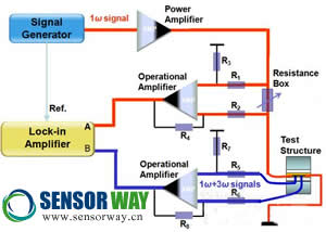 圖2 用于微孔膜測(cè)量的自適應(yīng)基于獨(dú)立型傳感器的3ω系統(tǒng),包含:信號(hào)發(fā)生器、鎖相放大器、前置放大器、運(yùn)算模塊(運(yùn)放、低溫漂電阻)及計(jì)算機(jī)自動(dòng)控制系統(tǒng)。