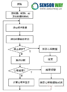 程序主流程如圖6所示,包括CPU初始化、LCD初始化、時鐘初始化、溫度傳感器18b20初始化、軟硬件自檢、讀取溫度和時間、按鍵掃描與控制等。由于心率檢測需24小時持續(xù)進行,因此,系統(tǒng)應(yīng)循環(huán)檢測,直到用戶按停止鍵。