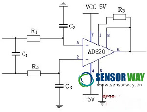 前置放大電路對于脈搏波信號采集來至關(guān)重要,考慮到脈搏信號的特點,心率信號采集屬于強噪聲環(huán)境下的微弱生理信號檢測,要求放大器具有高共模和差模輸入阻抗;低輸出阻抗、精確和穩(wěn)定的增益、高共模抑制比;谝陨戏治觯x用ANALOG DEVICES退出的低功耗、高精度儀表放大器AD620作為前置放大的核心器件。放大電路設(shè)計如圖2所示。AD620由三個放大器組成,內(nèi)部采用三運放典型電路,可實現(xiàn)1~1000增益任意調(diào)節(jié),其調(diào)節(jié)是通過引腳1和8的連接阻抗R3實現(xiàn)。