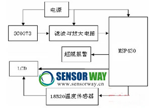 心率是人體非常重要的生理參數(shù),而傳統(tǒng)的脈診由于其非定量和主觀性影響了心率測試的精度,為了提高對心率監(jiān)測的精度和監(jiān)測的方便性,本系統(tǒng)采用壓電陶瓷傳感器和MSP430芯片組成測試系統(tǒng),系統(tǒng)硬件結(jié)構(gòu)如圖1所示。通過ADC10片上溫度傳感器采集溫度,就可以在數(shù)碼管上顯示。同時SC0073壓電陶瓷傳感器采集的信號經(jīng)濾波和放大后與設(shè)定壓力閾值進行比較,對脈搏波信號進行處理,并根據(jù)處理結(jié)果進行精確計數(shù)和顯示。