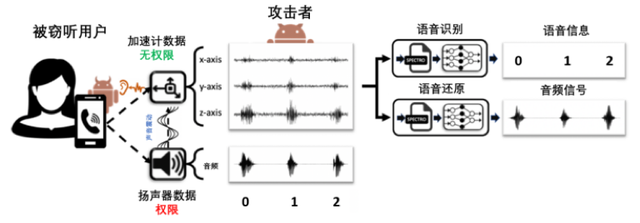 “加速度傳感器是目前智能手機(jī)中最常見的一種嵌入式傳感器,主要用于探測手機(jī)本身的移動,常見的應(yīng)用場景包括移動檢測、步數(shù)統(tǒng)計、游戲控制等!比慰嬖V記者,它之所以能被用來監(jiān)聽電話,主要是由于智能手機(jī)本身的物理結(jié)構(gòu),“由于聲音信號是一種由震動產(chǎn)生的可以通過一些介質(zhì)進(jìn)行傳播的聲波,因此手機(jī)揚(yáng)聲器發(fā)出的聲音會引起手機(jī)的震動,而加速度傳感器可以準(zhǔn)確感知到這些震動,因此攻擊者可以通過它來捕捉聲音信號引起的手機(jī)震動進(jìn)而推斷出其中所包含的敏感信息。”