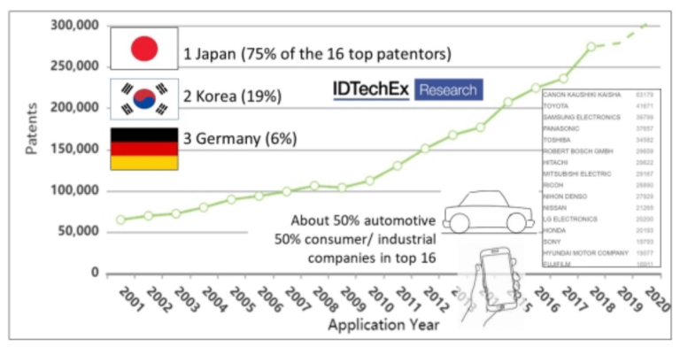 實際上,傳感器技術的創(chuàng)新正在發(fā)展。市場分析師估計,已針對汽車雷達,LiDAR,生物傳感器以及印刷和柔性傳感器等領域的應用授予了80多項新專利。日本名列前茅,占16個頂級專利接受國的四分之三。三星電子是前五名中唯一的非日本公司,依次為佳能,豐田,松下和東芝。