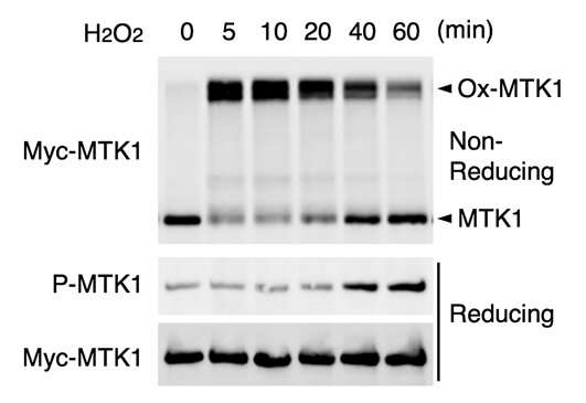 氧化應(yīng)激誘導(dǎo)的MTK1活化需要MTK1的氧化和還原。將細(xì)胞用H2O2處理指定的時(shí)間。細(xì)胞提取物在非還原條件下進(jìn)行電泳,并用抗Myc抗體進(jìn)行免疫印跡(上圖)。免疫沉淀的Myc-MTK1在還原條件下進(jìn)行電泳,并用抗P-MTK1或抗Myc抗體(中間和底部)進(jìn)行探測(cè)。圖片來(lái)源:東京大學(xué)醫(yī)學(xué)科學(xué)研究所