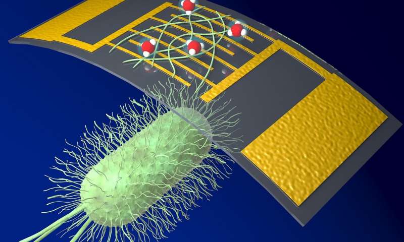 該傳感器使用源自細菌Geobacter 的導電蛋白納米線為電子設備提供生物材料。30多年前,資深作家和微生物學家德里克·洛夫利(Derek Lovley)在河泥中發(fā)現(xiàn)了Geobacter。微生物會長出像頭發(fā)一樣的蛋白質(zhì)細絲,充當納米級“金屬絲”,以轉(zhuǎn)移電荷來滋養(yǎng)它們并與其他細菌交流。