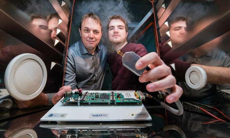 一個即使在高溫工業(yè)烤箱中也能精確測量空氣濕度的傳感器系統(tǒng):由AndreasSchütze教授領導的研究團隊的項目經理Tilman Sauerwald(左)和博士生Henrik Lensch。(照片來源:Oliver Dietze