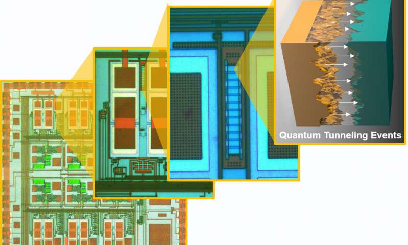 量子隧穿傳感器芯片組和匹配的Fowler-Nordheim隧穿勢壘的顯微照片。圖片提供:圣路易斯華盛頓大學(xué)麥凱維工程學(xué)院Chakrabartty實驗室