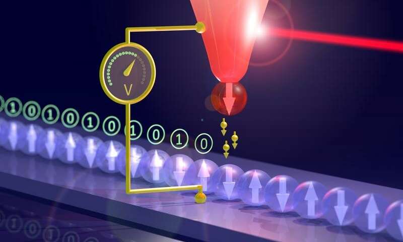 實(shí)驗(yàn)裝置的示意圖:掃描隧道顯微鏡的尖端被激光束加熱,產(chǎn)生電壓,該電壓用于從磁性原子讀取信息。