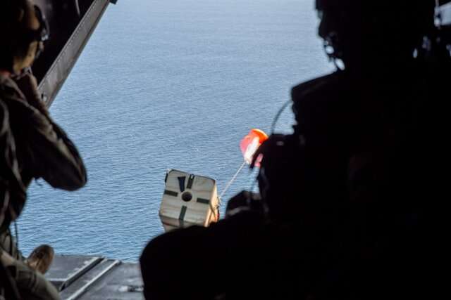 伍茲霍爾海洋研究所的一名乘務(wù)員和一名科學(xué)家在太平洋上空飛行了數(shù)千英尺,將一架美國海軍陸戰(zhàn)隊MV-22魚鷹式飛機(jī)的圓柱狀浮標(biāo)扔了起來。裝有數(shù)據(jù)收集傳感器以測量水下狀況,浮子在打開橙色降落傘以緩解飛濺之前迅速墜落。
