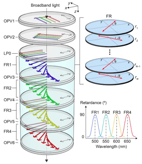 P-OPV對(duì)光的響應(yīng)根據(jù)光的偏振而變化,而延遲器則根據(jù)其偏振態(tài)以確定性的方式分散光。利用這種架構(gòu),該傳感器可以檢測(cè)設(shè)備中足夠小以適合智能手機(jī)的兩種類型的光。