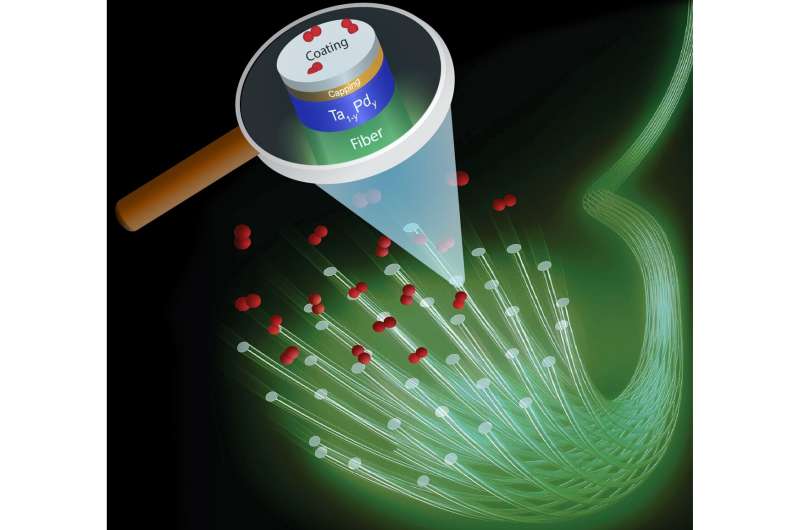 圖1.光學(xué)氫傳感器如何工作的示意圖。在氫附近,鉭(Ta)和鈀(Pd)基材料吸收氫(H)。該區(qū)域中的氫氣量越大,材料吸收的氫氣越多。隨著材料吸收氫,其光學(xué)性質(zhì)會(huì)發(fā)生變化。通過(guò)例如測(cè)量由材料反射的光的量,可以確定氫壓力或氫濃度。圖片來(lái)源:TU Delft
