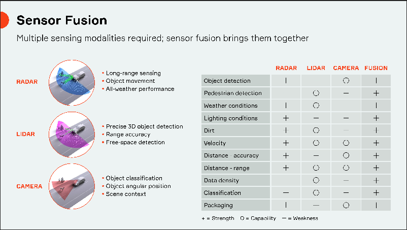 每種傳感器類型或“模態(tài)”都有其固有的優(yōu)點(diǎn)和缺點(diǎn)。雷達(dá)即使在惡劣的天氣條件下也能準(zhǔn)確確定距離和速度,但非常強(qiáng)大,但無法讀取路牌或“看到”交通信號燈的顏色。相機(jī)可以很好地讀取標(biāo)志或?qū)ξ矬w進(jìn)行分類,例如行人,騎自行車的人或其他車輛。但是,它們很容易被灰塵,陽光,雨水,雪或黑暗所蒙蔽。激光雷達(dá)可以準(zhǔn)確地檢測物體,但是它們沒有相機(jī)或雷達(dá)的承受能力或承受能力。