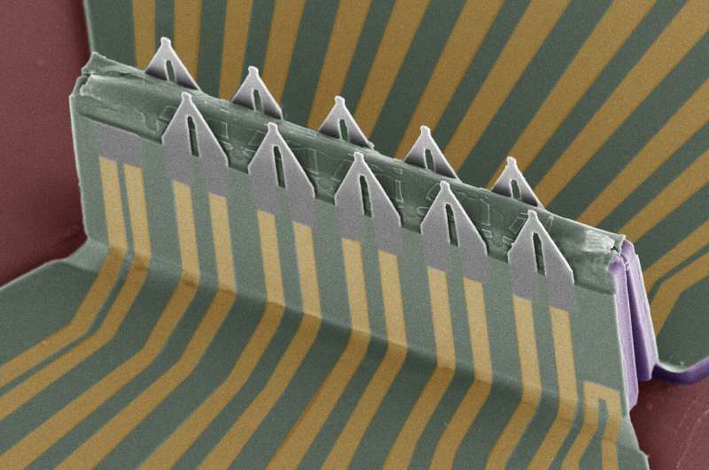 “彈出式”傳感器的 SEM 圖像,可直接測(cè)量心臟細(xì)胞內(nèi)電信號(hào)的速度和運(yùn)動(dòng)。