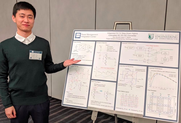 由 PMIC 博士資助 學生 Ziyu Xia 展示了他的項目“An Integrated 5:1 DC-DC converter”。圖片由 Andrila Hait 和達特茅斯大學提供