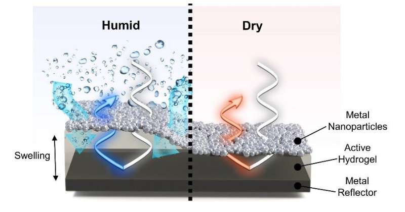 研究小組制造了一種比色傳感器,該傳感器由金屬-水凝膠-金屬結(jié)構(gòu)組成,使用無序金屬納米顆粒層(殼聚糖水凝膠)和反射基板。當(dāng)外界濕度變化時(shí),由于殼聚糖水凝膠在潮濕狀態(tài)下膨脹,在干燥狀態(tài)下反復(fù)收縮的特性,傳感器的諧振頻率也會(huì)發(fā)生變化。