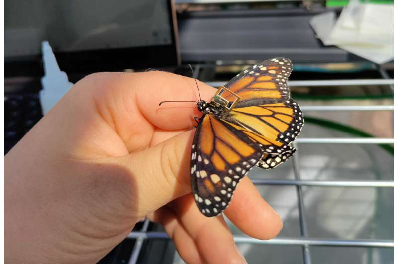 為了測試 mSAIL 的潛力,研究人員將該系統(tǒng)連接到植物園中的一只活帝王蝶身上。芯片粘在蝴蝶上;它沒有問題飛行,打開和關(guān)閉它的翅膀,或者在芯片就位的情況下進行任何其他正常的蝴蝶行為。