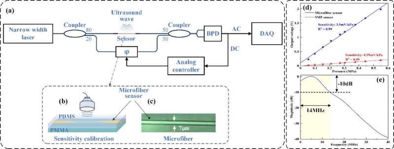 鑒于較大的倏逝場,研究人員將超細(xì)纖維的直徑優(yōu)化為 7μm。如圖1b所示,通過使用具有高彈性光學(xué)系數(shù)的聚二甲基硅氧烷(PDMS)材料來封裝微纖維,進(jìn)一步提高了傳感器的靈敏度。當(dāng)超聲波作用在傳感器上時(shí),由于彈性光學(xué)效應(yīng),PDMS的折射率會發(fā)生相應(yīng)的變化,從而導(dǎo)致微纖維的有效折射率發(fā)生調(diào)制。構(gòu)建了一個(gè)馬赫-曾德爾干涉儀來解調(diào)由入射超聲波引起的詢問激光的相位變化. 基于比例積分微分(PID)方法的反饋穩(wěn)定器用于補(bǔ)償由噪聲引起的低頻波動。實(shí)驗(yàn)結(jié)果表明,與標(biāo)準(zhǔn)單模光纖傳感器相比,線性超細(xì)纖維超聲傳感器的靈敏度提高了一個(gè)數(shù)量級。該傳感器具有 153Pa 的低噪聲等效壓力和高達(dá) 14MHz (-10dB) 的寬響應(yīng)帶寬。此外,該傳感器可用于微弱信號的檢測,通過優(yōu)化超細(xì)纖維和檢測系統(tǒng),提高傳感器的靈敏度和帶寬。