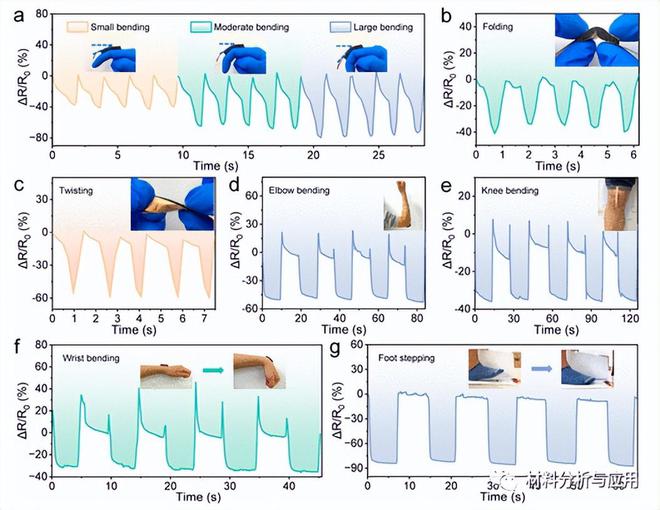 圖4. RGO@PU海綿傳感器在人體運(yùn)動(dòng)檢測的各種應(yīng)變中的應(yīng)用