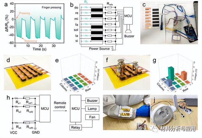 綜上所述,壓阻式傳感器由高彈性3D多孔PU海綿組裝而成,該海綿包裹有導(dǎo)電RGO層,在壓縮過程中提供導(dǎo)電路徑。當(dāng)受到外部刺激時(shí),導(dǎo)電RGO層中的微裂紋、變形和海綿骨架的接觸會導(dǎo)致電阻變化,使海綿傳感器具有更高的靈敏度(17.65 kPa–1)和長期耐用性(8000 次循環(huán))。此后,傳感器可用于準(zhǔn)確檢測有規(guī)律的人體運(yùn)動(dòng)(例如,手指彎曲、手腕彎曲),或識別具有不同輸出電信號的各種重量的物體。此外,集成傳感器陣列和信號采集電路應(yīng)用于柔性電子鋼琴制造、電子皮膚以及通過藍(lán)牙技術(shù)遠(yuǎn)程實(shí)時(shí)控制家用電子產(chǎn)品,為柔性電子在智能應(yīng)用場景中提供了可行的嘗試。