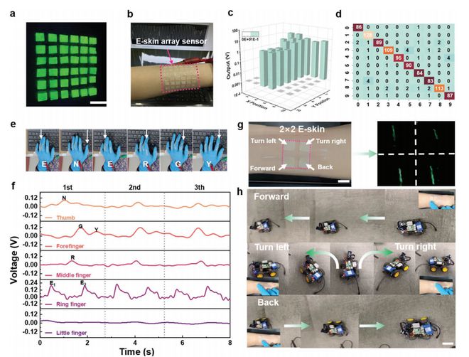 傳感器應(yīng)用主要為一個(gè)自供電的6×6皮膚陣列傳感器,通過給出雙信號來繪制壓力圖。當(dāng)像素1-6、9、10、15、16、21、22、27、28、33和34被手指按順序按下時(shí)(字符“T”的軌跡),相關(guān)像素的出現(xiàn)電壓,并顯示了字母的軌跡。通過開發(fā)一個(gè)集成了機(jī)器人技術(shù)的無線信號傳輸模塊和分類指令的軟件,建立了一個(gè)智能控制系統(tǒng)。當(dāng)手指在簡化的電子皮膚的4個(gè)象限上書寫,微型汽車根據(jù)書寫坐標(biāo)執(zhí)行向前、后退、左、右轉(zhuǎn)。這樣,汽車就能夠及時(shí)修改其移動(dòng)軌跡,避開障礙物,說明該控制系統(tǒng)是有效率、靈活的。