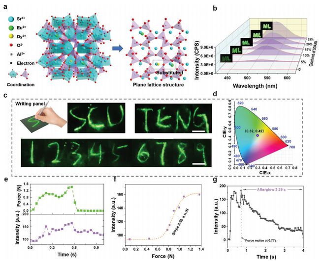 SAOED的最大激發(fā)波長位于360 nm。發(fā)射峰在450-600nm之間為綠色發(fā)光,中心峰在≈520nm。隨后研究了熒光強(qiáng)度與SAOED含量之間的相關(guān)性。可以觀察到,隨著熒光粉的摻雜質(zhì)量上升到25 wt.%,其強(qiáng)度增加了兩個(gè)數(shù)量級。通過機(jī)械磨削降低了商用SAOED的平均尺寸,以研究粒徑對發(fā)光性能的影響。發(fā)射波長的SPH薄膜與熒光粉(最大粒徑≈20µm)轉(zhuǎn)向長波長(1納米),而光致發(fā)光強(qiáng)度增加了11%,這可能是歸因于Eu2+發(fā)光中心暴露在熒光粉的表面積大小減少。優(yōu)化后,得到的傳感器實(shí)現(xiàn)“1-9”數(shù)字和“SCU”、“TENG”字母的完整軌跡顯示,具有高時(shí)空分辨率,可以被肉眼實(shí)時(shí)識(shí)別。以“S”的寫跡為例,其發(fā)光強(qiáng)度的變化與剪切力的變化相一致。結(jié)果表明,發(fā)射量在1.42 N時(shí)達(dá)到最高強(qiáng)度,最低的探測力為≈0.082N,器件的機(jī)械靈敏度高達(dá)9.69 a.u. N-1。
