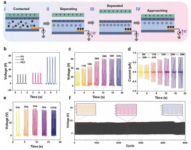 當(dāng)不同電子親和的物體在外力作用下與SPH層接觸時(shí),其表面產(chǎn)生等數(shù)的正負(fù)電荷。當(dāng)兩種材料分離時(shí),就形成了一個(gè)電位差。SPH表面的負(fù)電荷驅(qū)動(dòng)陽離子不斷轉(zhuǎn)移到離子凝膠中,以保持靜電平衡。同時(shí),由于電雙層的極化,在離子凝膠與金屬線的界面上形成相同數(shù)量的電子,通過外部電路流入地面。當(dāng)兩種摩擦電材料再次接觸時(shí),整個(gè)過程發(fā)生逆轉(zhuǎn)。因此,在周期性的接觸和分離過程中,垂直力被連續(xù)地傳遞到交流電壓/電流輸出中。文章測量了機(jī)械傳感器的電輸出性能。開路電壓(VOC)和短路電流(ISC)的形狀分別為上單峰和非下雙峰。當(dāng)施加的力從5N增加到41 N時(shí),VOC的峰值從33增加到62 V,ISC從0.71提高到1.62µA。