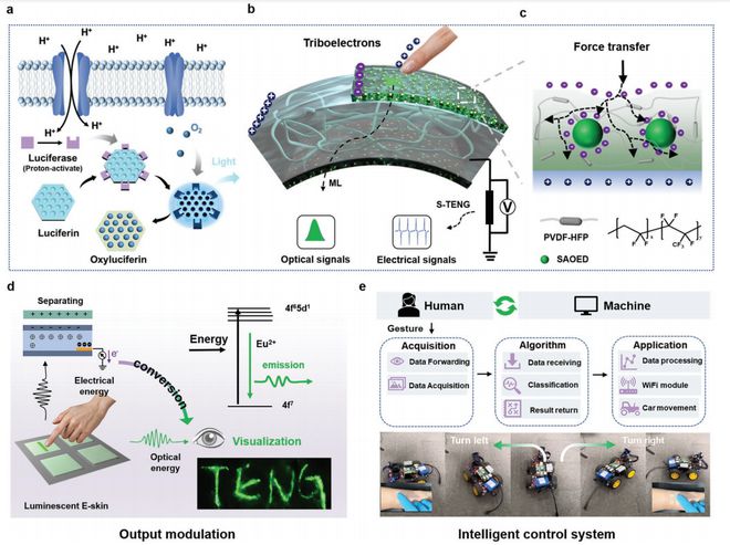 近期,四川大學(xué)張新星團(tuán)隊(duì)研發(fā)了一種可以實(shí)現(xiàn)電/光雙輸出的生物啟發(fā)機(jī)械傳感器。該傳感器具有機(jī)械發(fā)光/摩擦電分層結(jié)構(gòu),能夠?qū)崟r(shí)地感知壓力和模式顯示。研究還發(fā)現(xiàn)界面摩擦電場對發(fā)光輸出和壓力可視化有促進(jìn)作用。所開發(fā)的機(jī)械傳感器具有自功率、雙信號和實(shí)時(shí)模式的感覺行為,具有低力檢測限(0.082 N)、高靈敏度(9.69 a.u. N-1),快速響應(yīng)(35 ms),和良好的可靠性(5000個(gè)循環(huán))。利用該機(jī)械傳感器構(gòu)建了一個(gè)個(gè)性化的人機(jī)交互系統(tǒng)(HMI),并演示了它在智能控制中的應(yīng)用。該工作以題為“Bioinspired Bimodal Mechanosensors with Real-Time, Visualized Information Display for Intelligent Control” 的文章發(fā)表于Advanced Functional Materials上。