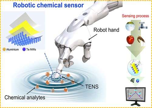 為了制造他們的TENS,該團(tuán)隊(duì)使用了一系列對(duì)汞敏感的碲納米線。這使得他們的傳感器具有高度選擇性,即使在復(fù)雜的樣品中也能挑選出目標(biāo)。研究人員將TENS安裝在機(jī)器人手的指尖上,并反復(fù)將其觸摸到樣品溶液中。電壓的變化以無線方式實(shí)時(shí)傳輸?shù)街悄苁謾C(jī),對(duì)應(yīng)于汞離子的存在與否。