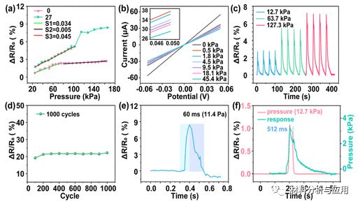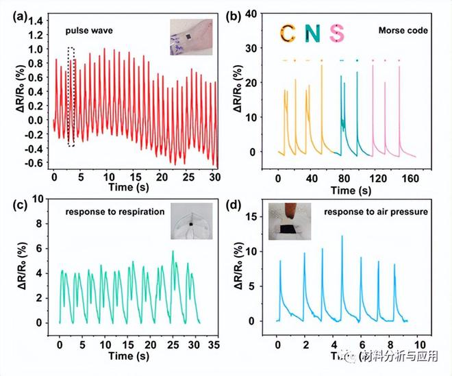 通過(guò)調(diào)整打印參數(shù),傳感層具有微點(diǎn)特征的GSCA 3D結(jié)構(gòu)可以提供低于60 ms的快速響應(yīng),并將靈敏度提高32.4%(26-78 kPa)、800%(78-102 kPa)和600%(102-160 kPa)。該傳感器具有11.4 Pa的低檢測(cè)限和較大的檢測(cè)范圍,線性靈敏度為1.4–509 kPa。兩個(gè)相鄰微點(diǎn)之間的蜘蛛腿狀微/納米纖維有助于電子傳輸和氣流傳感。結(jié)果表明,基于石墨烯的點(diǎn)傳感器在識(shí)別空氣強(qiáng)度以及呼吸和氣流方向方面的可行性。GSCA在實(shí)時(shí)個(gè)人監(jiān)控中的進(jìn)一步驗(yàn)證證明了多任務(wù)可穿戴傳感器的潛力。