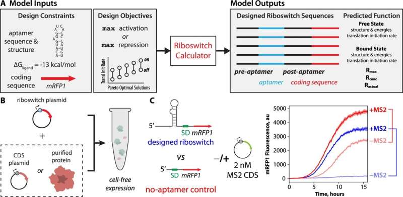“過(guò)去設(shè)計(jì)這種核糖開關(guān)傳感器的努力在很大程度上依賴于試錯(cuò)實(shí)驗(yàn),例如,構(gòu)建和表征大型隨機(jī)文庫(kù)以識(shí)別有效的核糖開關(guān)變體 - 遺傳藍(lán)圖和適配體,”Salis說(shuō)。“結(jié)合熱力學(xué)建模和計(jì)算優(yōu)化,我們合理地設(shè)計(jì)了新的核糖開關(guān),這些核糖開關(guān)被預(yù)測(cè)為良好的蛋白質(zhì)傳感器,然后我們對(duì)其進(jìn)行了測(cè)試。我們的設(shè)計(jì)算法稱為Riboswitch計(jì)算器。