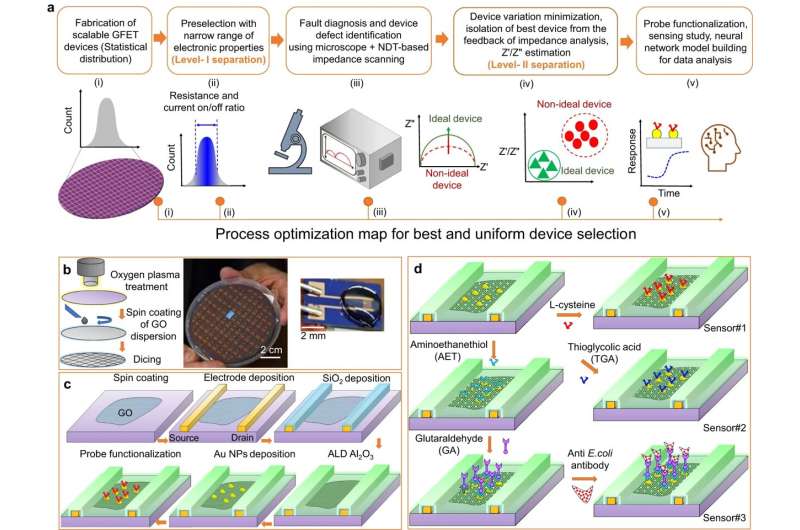 石墨烯基場效應(yīng)晶體管(GFET)傳感器陣列的晶圓級納米制造和功能化。一種原理圖納米制造策略,使用阻抗測量進(jìn)行器件預(yù)選(故障診斷),以小化器件變化,以實現(xiàn)近乎理想的響應(yīng)模式。測試/分析程序的每個步驟都示意性地顯示(i-v),并在插圖中附有相應(yīng)的描述。b 將氧化石墨烯(GO)分散液旋涂到整個晶圓基板上,用于沉積圖案電極。照片顯示了切割后的晶圓尺寸傳感器器件和表面有一滴測試溶液的單個器件。c 基于rGO的FET傳感器器件的納米制造步驟包括通過電子束光刻進(jìn)行電極沉積,SiO的沉積2使用電子束光刻、3 nm 原子層沉積 (ALD) 衍生的 Al 在電極上的保護(hù)層2O3作為頂部柵極氧化物,濺射金納米顆粒(NPs)作為探針的錨定位點,并實現(xiàn)探針功能化。d 傳感器1-3使用特定生化和抗體探針進(jìn)行探針功能化的示意圖步驟。自然通訊 (2023)。DOI: 10.1038/s41467-023-39701-0