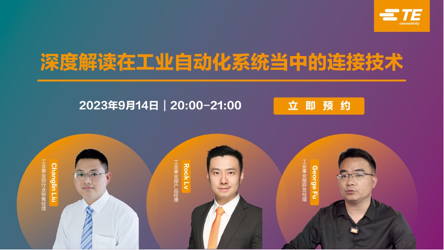 與此同時,2023年9月14日(下周四) 20:00 – 21:00,TE 工業(yè)事業(yè)部誠邀您參加我們的線上研討會,一同暢聊工業(yè)自動化系統(tǒng)中的連接技術(shù)!