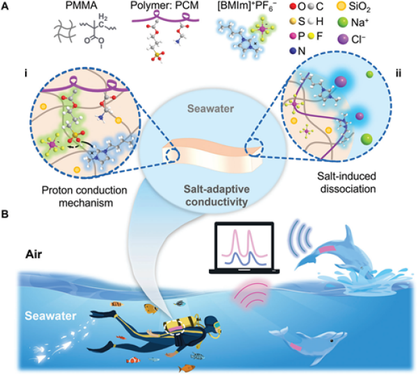 近年來,中國科學(xué)院寧波材料技術(shù)與工程研究所智能高分子材料團隊研究員陳濤和博士魏俊杰,致力于離子導(dǎo)電凝膠基智能傳感材料的研究,并利用疏水界面對水分子和導(dǎo)電離子的擴散屏障功能實現(xiàn)了導(dǎo)電凝膠材料的水下多功能傳感應(yīng)用。然而,含鹽海水的高導(dǎo)電性會對離子凝膠傳感器的傳感性能產(chǎn)生明顯的抑制作用,導(dǎo)致離子導(dǎo)電凝膠的海洋傳感性能存在不足。對此,該團隊近期在疏水界面結(jié)構(gòu)的基礎(chǔ)上,進一步利用質(zhì)子導(dǎo)電機制和鹽誘導(dǎo)解離效應(yīng)設(shè)計了在海水環(huán)境中具有鹽適應(yīng)能力的離子液體凝膠材料,實現(xiàn)了海洋傳感應(yīng)用。